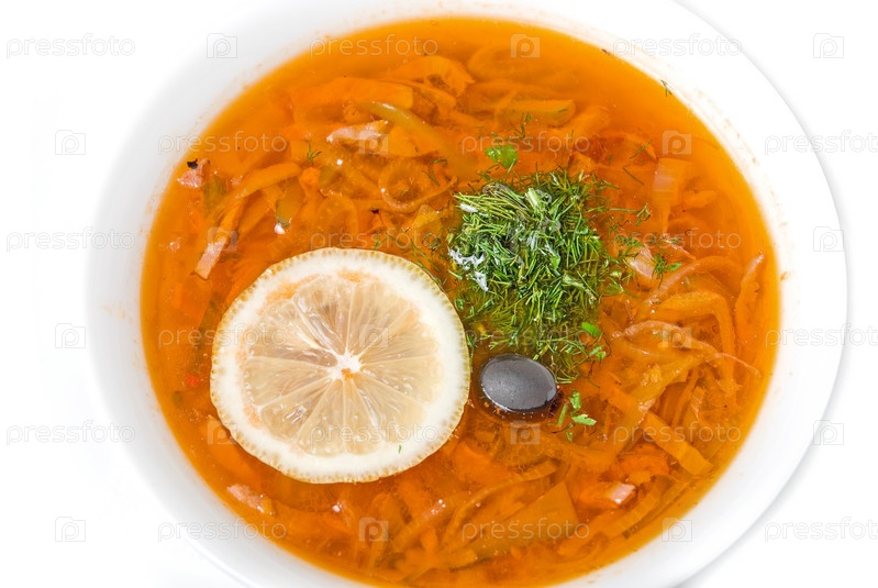 Овощной суп с лимоном и маслиной в тарелке, белый фон