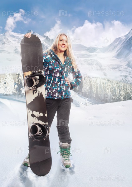 Девушка с сноуборд стоял на горе