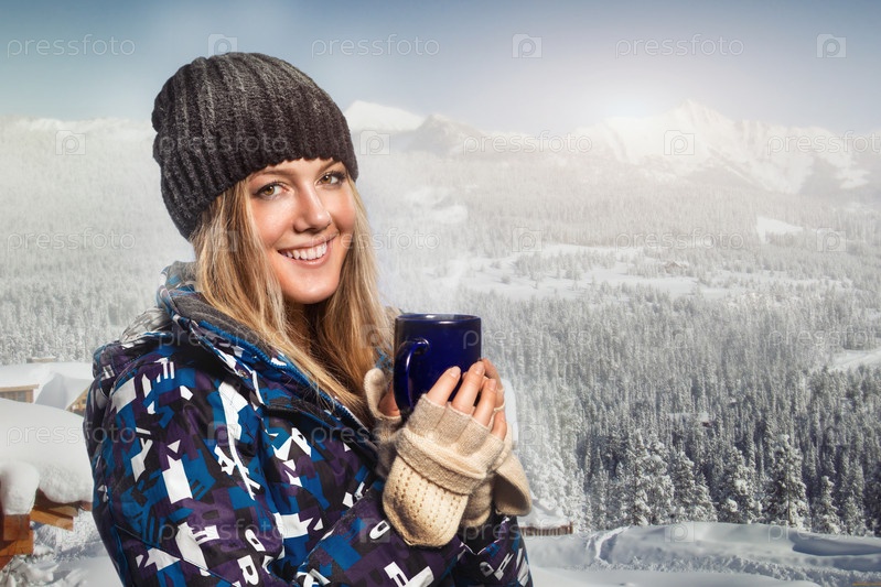 Девушка, держа чашку и утепленные
