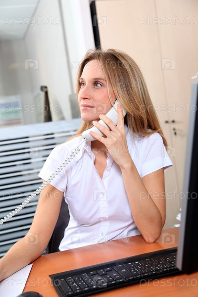 Женщина разговаривает по телефону в офисе
