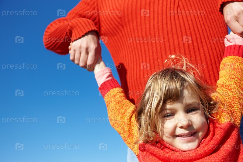 Руки отца и улыбается милая дочь, селективный акцент на глаза