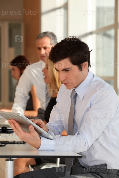 Бизнесмен в офисе с электронным вкладку
