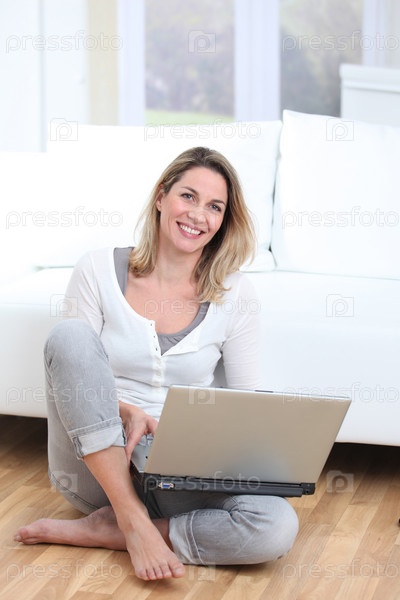 Блондинка женщина, используя портативный компьютер у себя дома