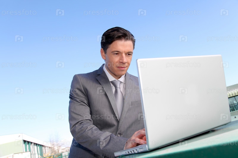 Улыбаясь бизнесмен, работающих вне с портативного компьютера