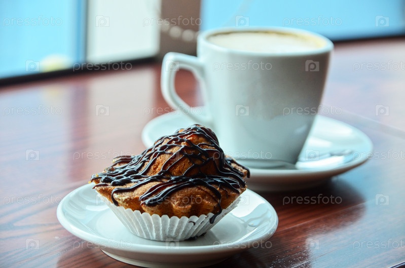 Шоколадный кекс и чашка кофе на столе