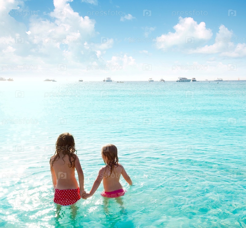 Вид на пляже, глядя на закат сзади детей девочек