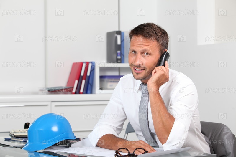 Менеджер сайтов в офисе с голубой шлем