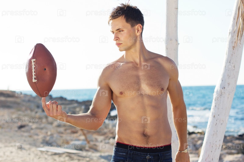 Молодой человек с мячом для регби на пляже