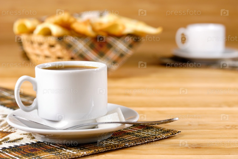 Чашка кофе с сахаром и куки на деревянный стол
