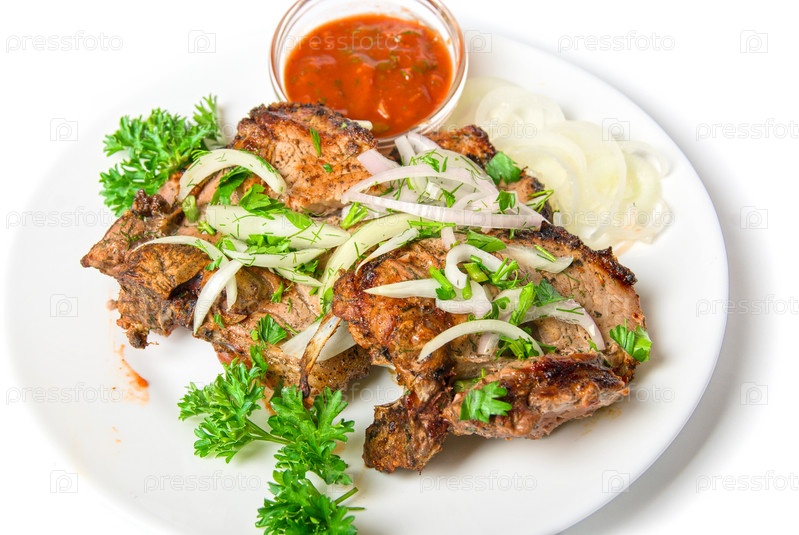 Мясо на гриле с соусом и овощами на белом фоне