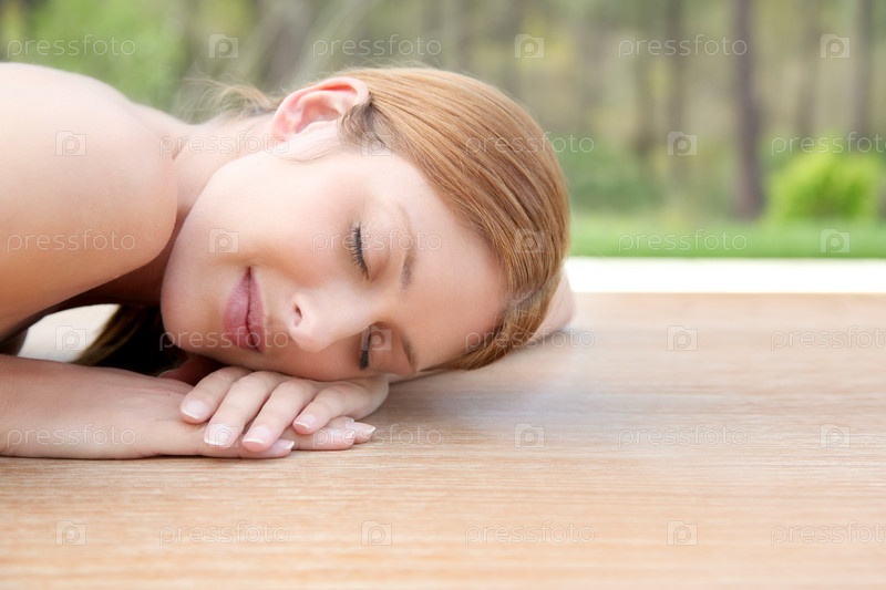 Красивая женщина, лежа на деревянной террасе