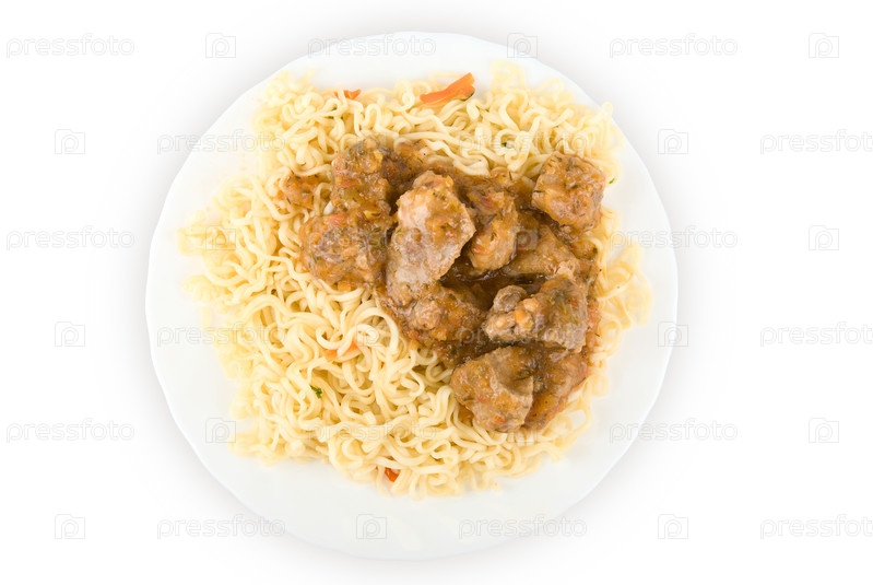 Тарелка с лапшой и мясом на белом фоне