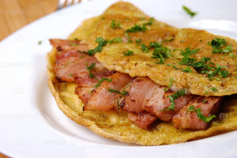 Омлет с беконом, подается на белом фоне