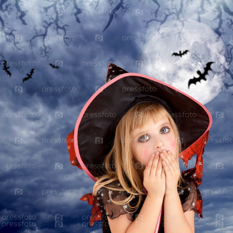Хэллоуин девушка испуганный ребенок на темное небо и Луна с битой