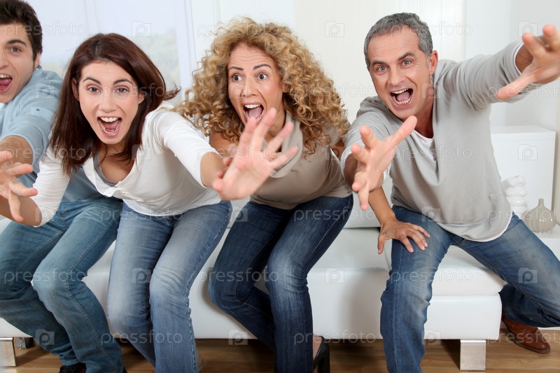 Группы друзей, сидя в диван смотреть спортивные игры по телевизору