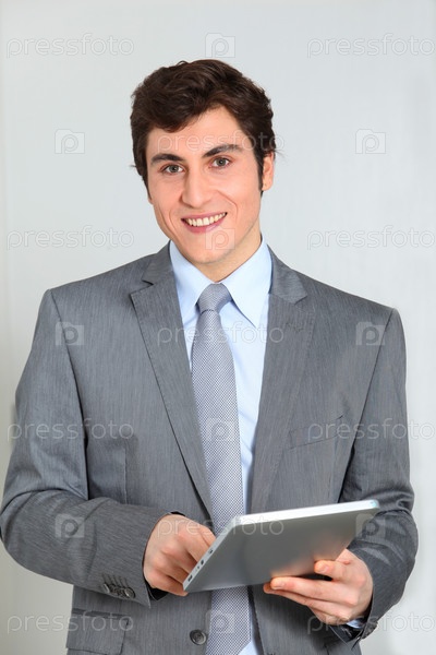 Бизнесмен, стоя с электронной площадки