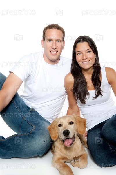 Пара в любви с щенка собака Золотой ретривер, изолированные на белом фоне