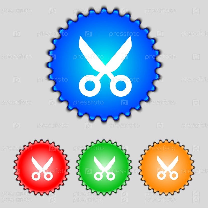 Ножницы парикмахерские знак значок. Портной символ. Красочные кнопки установки. Вектор