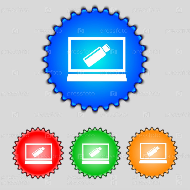 Флэш-накопитель USB и монитор значок символа. Символ видеоигры. Красочные кнопки установки. Вектор