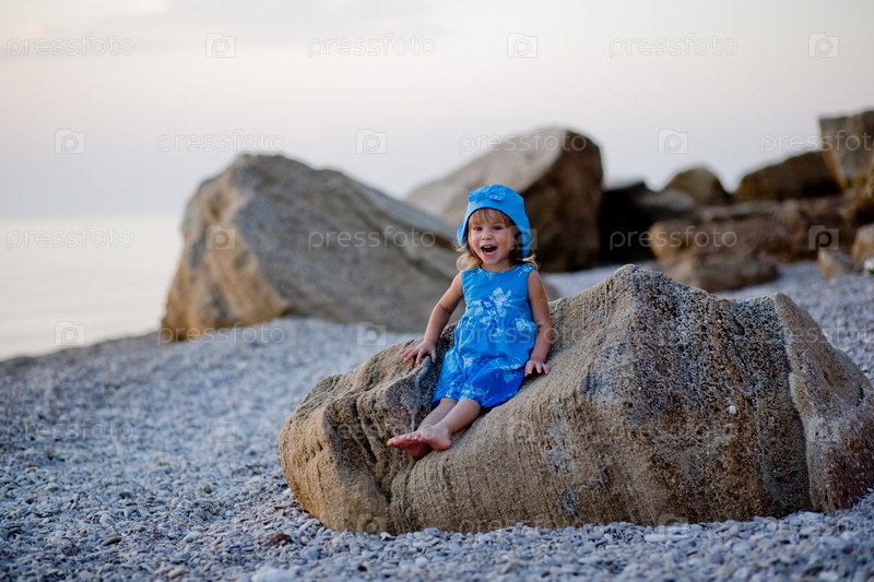 Маленькая девочка, сидящая на камне на пляже