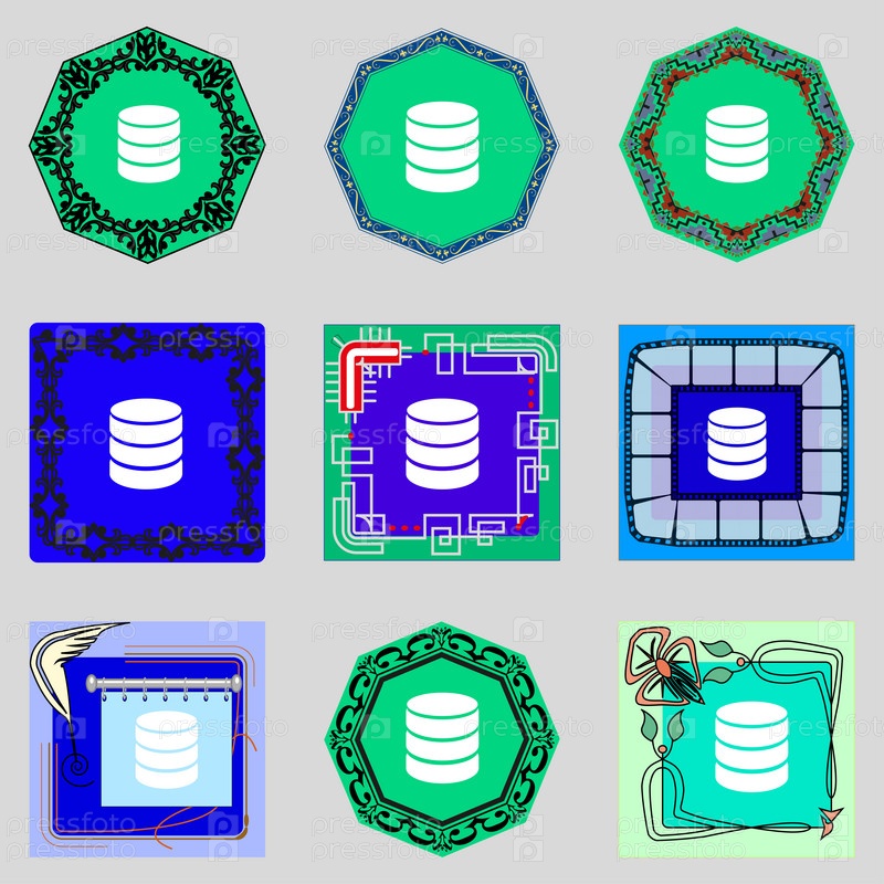 Жесткий диск и знак значок базы данных. флэш-накопитель палку символ. Красочные кнопки установки. Вектор