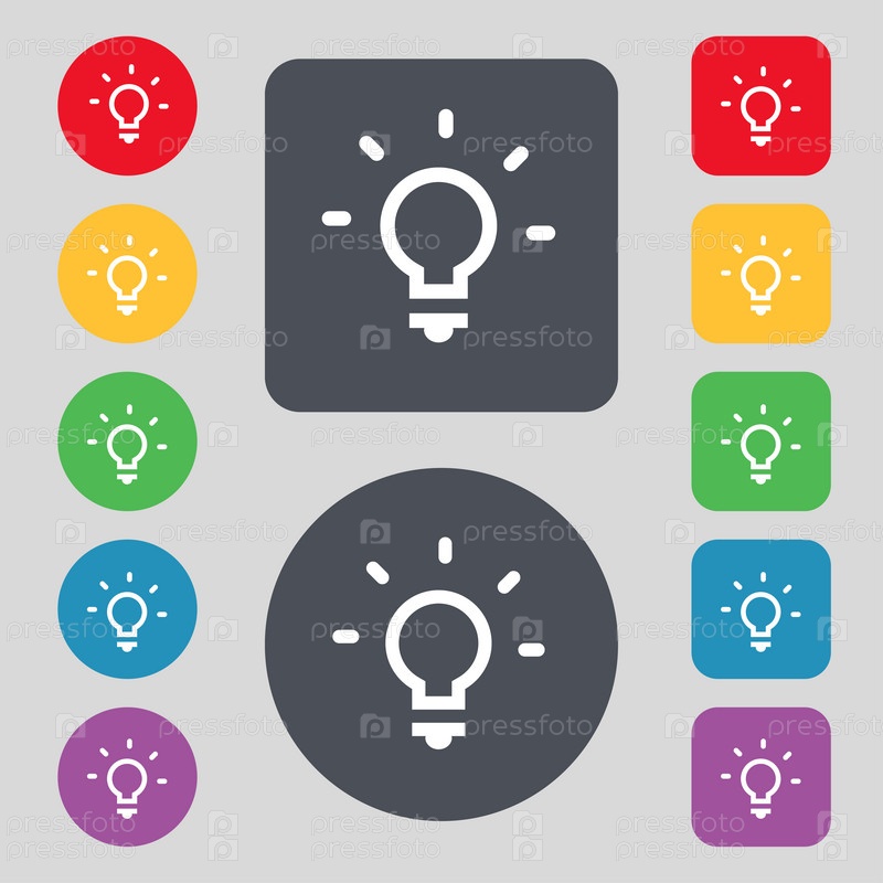 Свет лампы, идея значок знак. Набор из 12 цветных кнопок. Плоский дизайн. Вектор