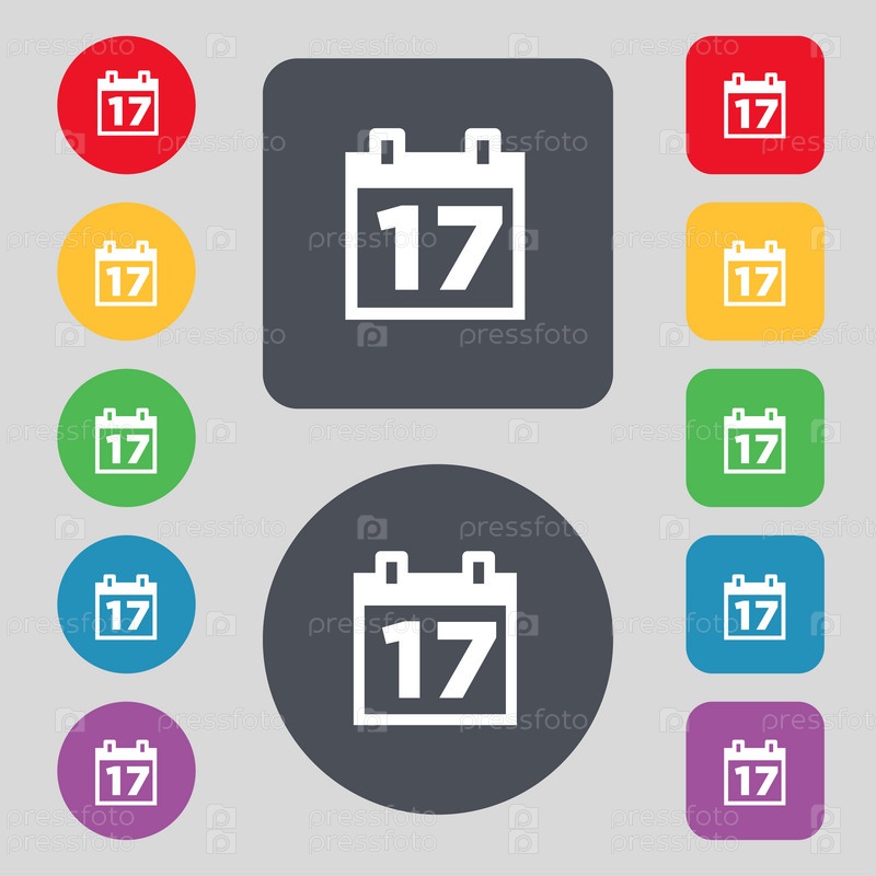 Знак значок календаря, даты или события напоминания. Набор из 12 цветных кнопок. Плоский дизайн. Вектор