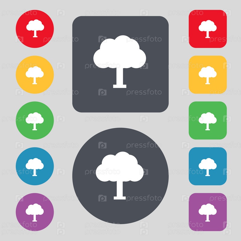 Дерево, лес значок знак. Набор из 12 цветных кнопок. Плоский дизайн. Вектор