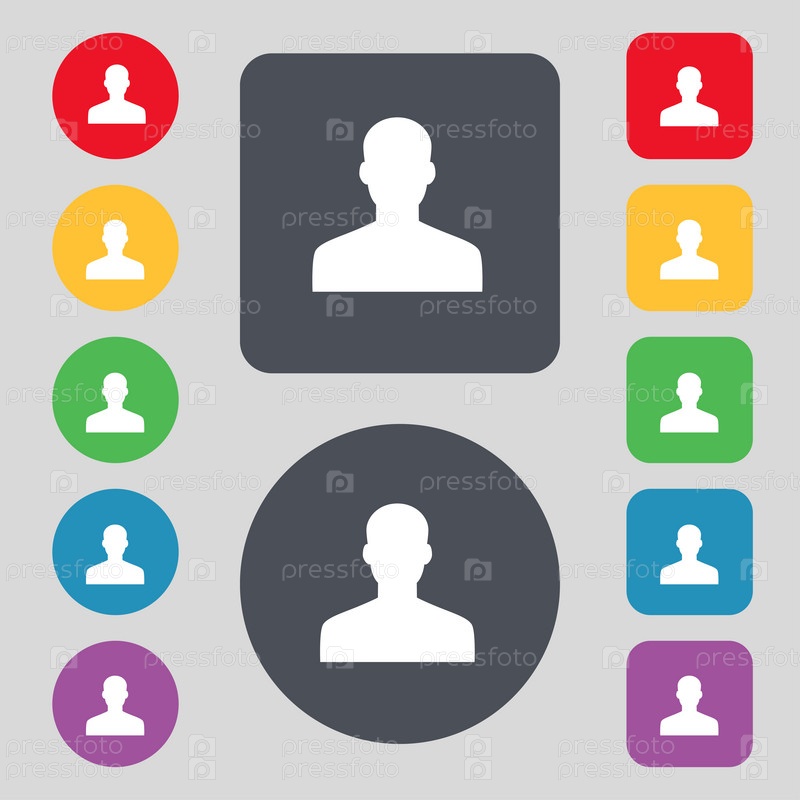 Пользователь, лицо, войти значок знак. Набор из 12 цветных кнопок. Плоский дизайн. Вектор