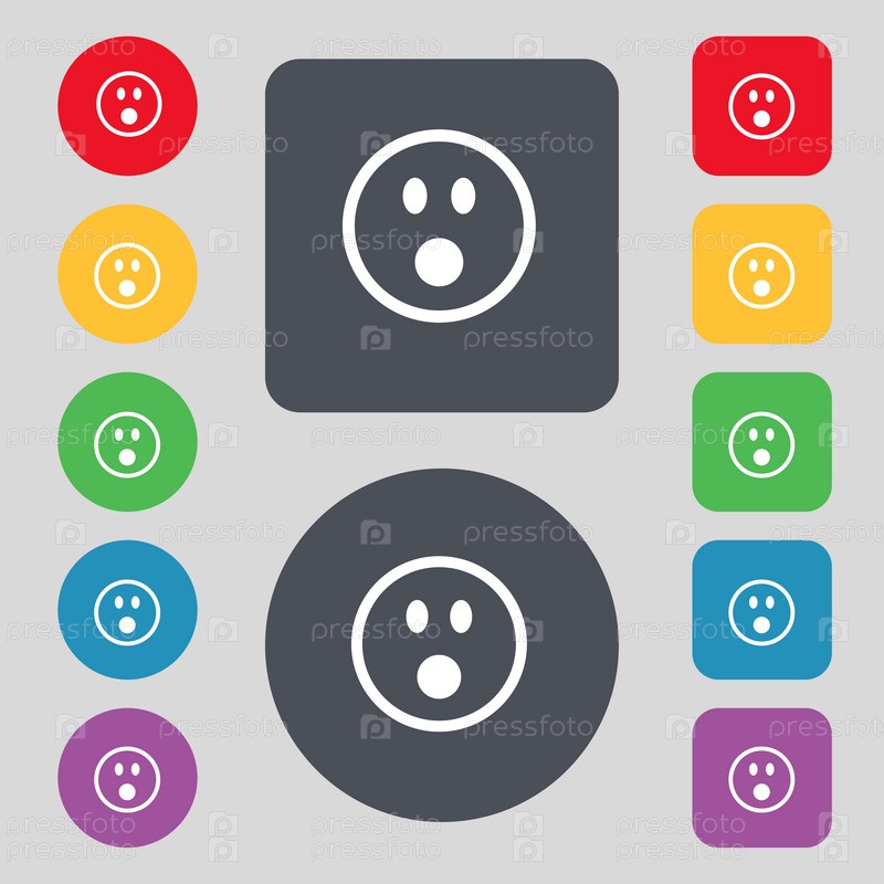 Шокированное лицо смайлик значок знак. Набор из 12 цветных кнопок. Плоский дизайн. Вектор