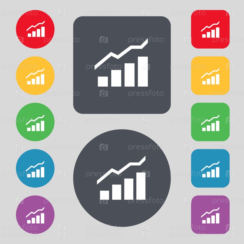 Концепции роста и развития. График курса значок знак. Набор из 12 цветных кнопок. Плоский дизайн. Вектор