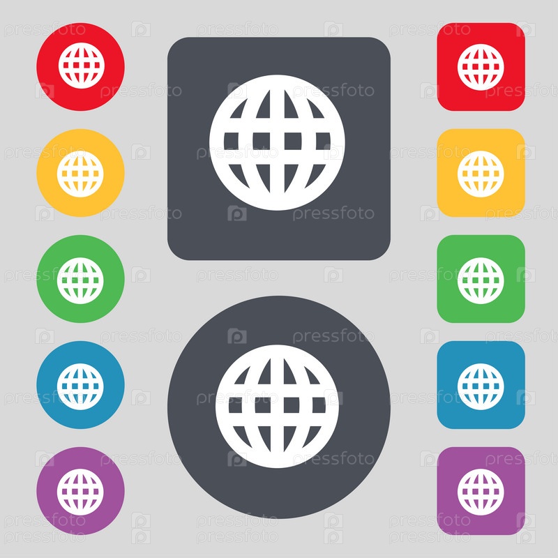 Глобус, карта мира География значок знак. Набор из 12 цветных кнопок. Плоский дизайн. Вектор
