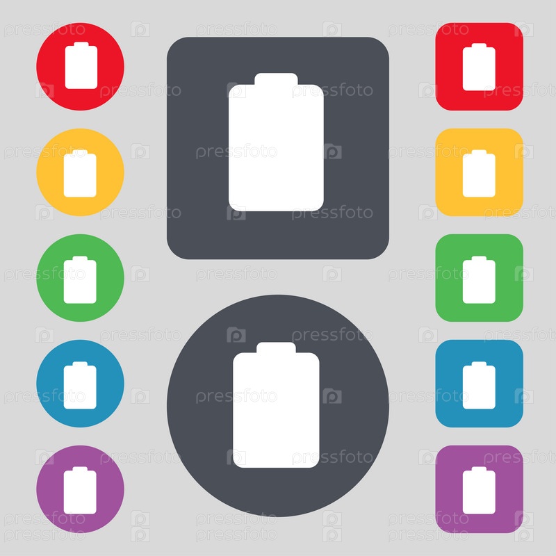 Батарея пуста, низкая электричество значок знак. Набор из 12 цветных кнопок. Плоский дизайн. Вектор