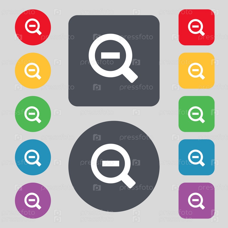 Лупа стекла, зум инструмент значок знак. Набор из 12 цветных кнопок. Плоский дизайн. Вектор