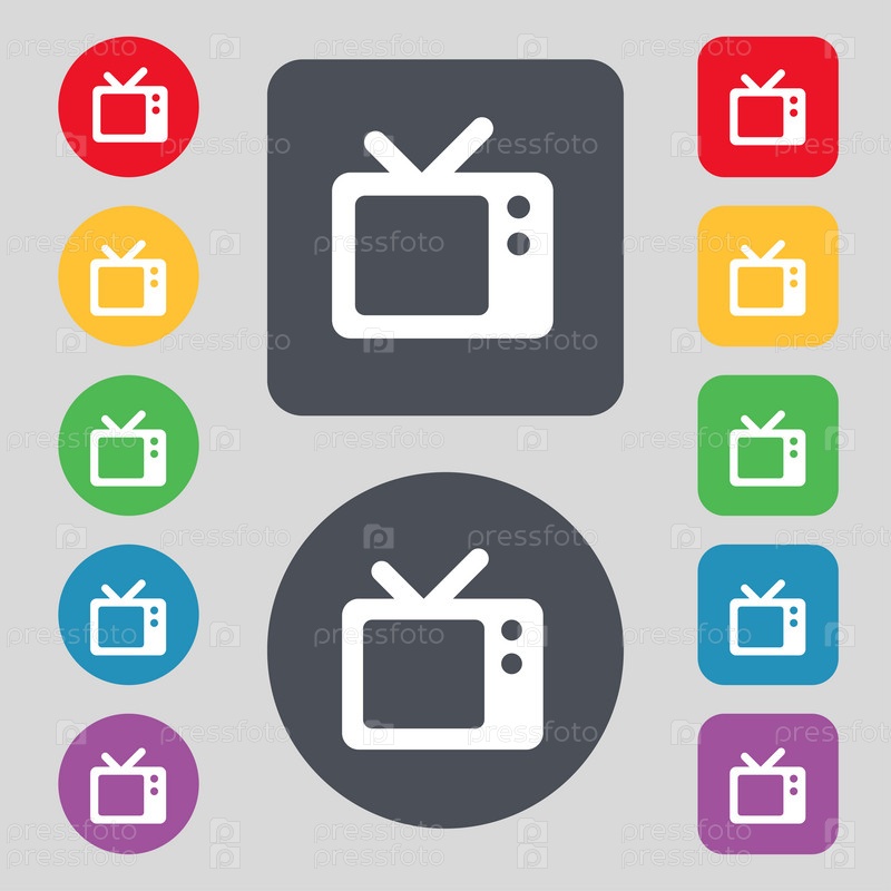 Ретро ТВ значок знак. Набор из 12 цветных кнопок. Плоский дизайн. Вектор