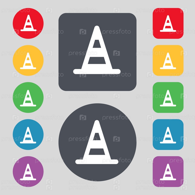 Дорожный знак значок конуса. Набор из 12 цветных кнопок. Плоский дизайн. Вектор