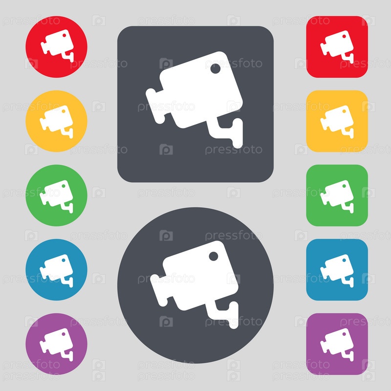 Видео камеры значок знак. Набор из 12 цветных кнопок. Плоский дизайн. Вектор