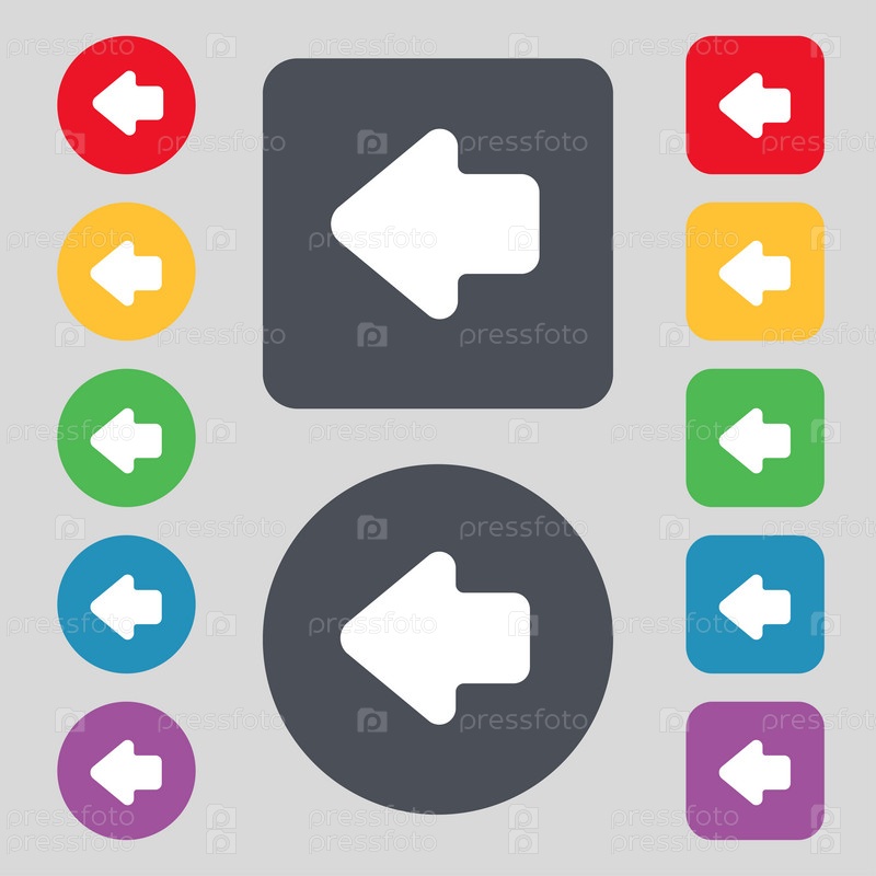 Стрелка влево, выход значок знак. Набор из 12 цветных кнопок. Плоский дизайн. Вектор