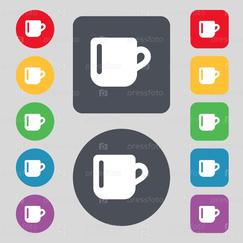 Чашка кофе или чая значок знак. Набор из 12 цветных кнопок. Плоский дизайн. Вектор