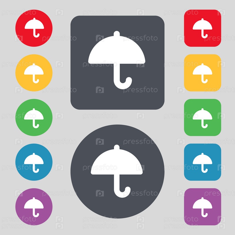 Зонтик значок знак. Набор из 12 цветных кнопок. Плоский дизайн. Вектор