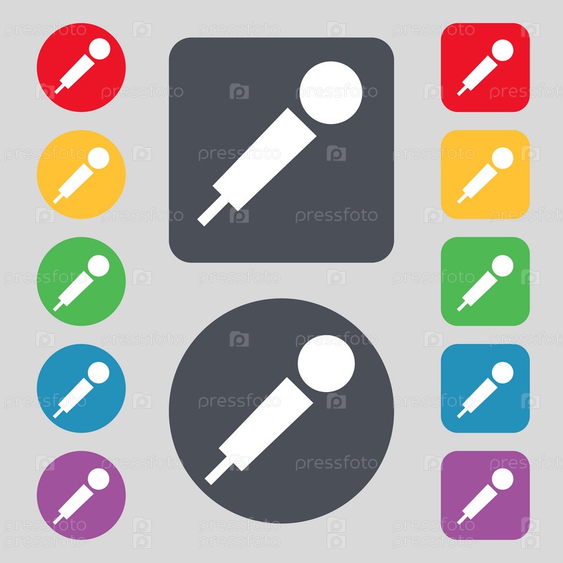 Значок микрофона знак. Набор из 12 цветных кнопок. Плоский дизайн. Вектор
