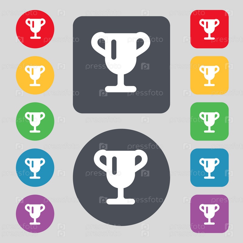 Победитель Кубка, награждение победителей, трофей значок знак. Набор из 12 цветных кнопок. Плоский дизайн. Вектор