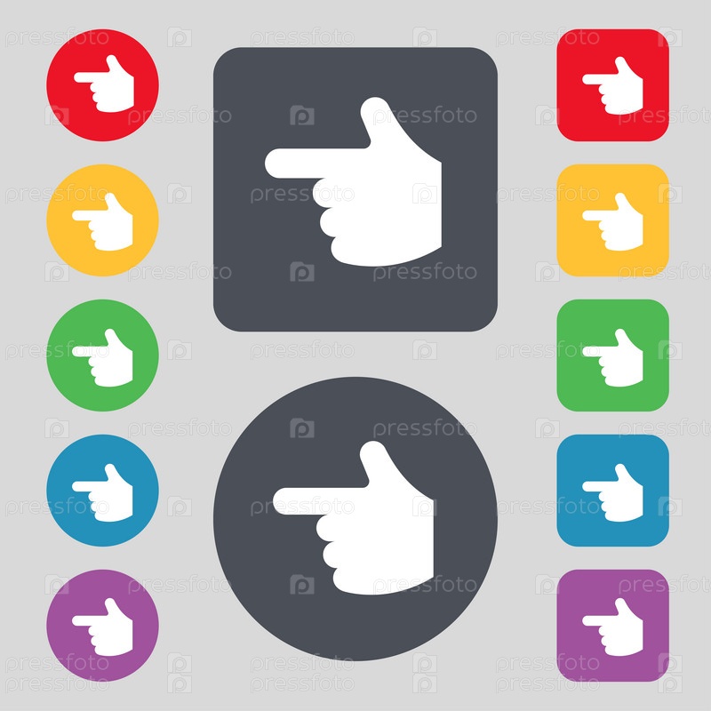 Указывает знак значок руки. Набор из 12 цветных кнопок. Плоский дизайн. Вектор