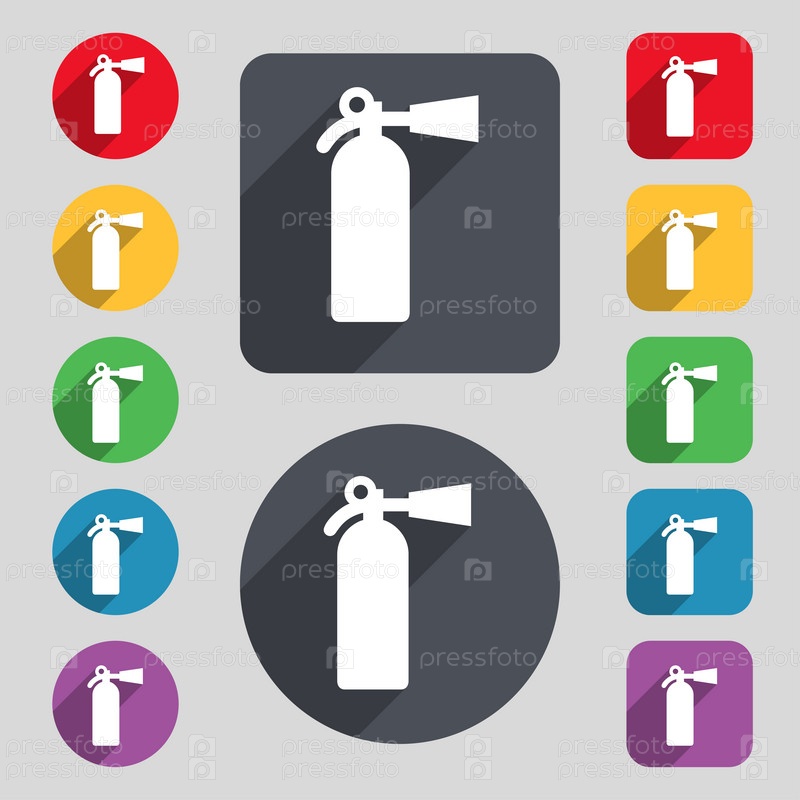Огнетушитель значок знак. Набор 12 цветных кнопок и длинную тень. Плоский дизайн. Вектор