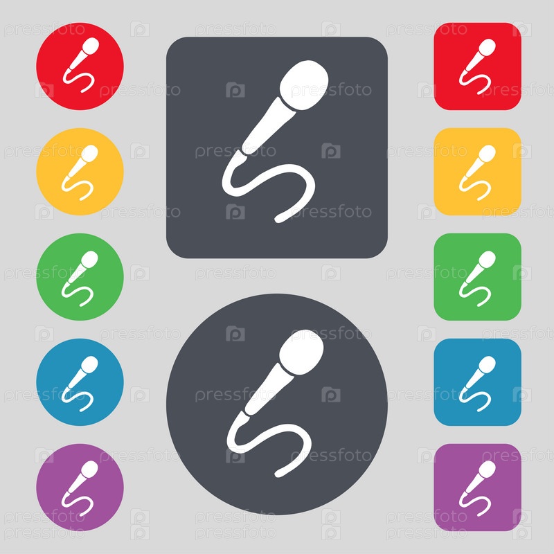 Значок микрофона знак. Набор из 12 цветных кнопок. Плоский дизайн. Вектор