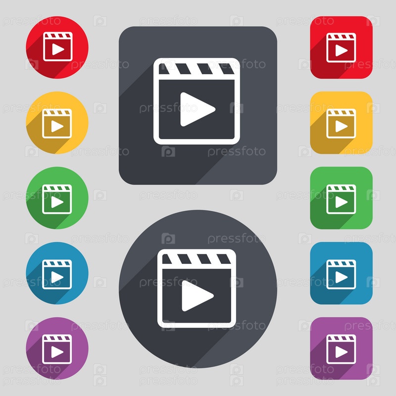 Играть видео значок знак. Набор 12 цветных кнопок и длинную тень. Плоский дизайн. Вектор