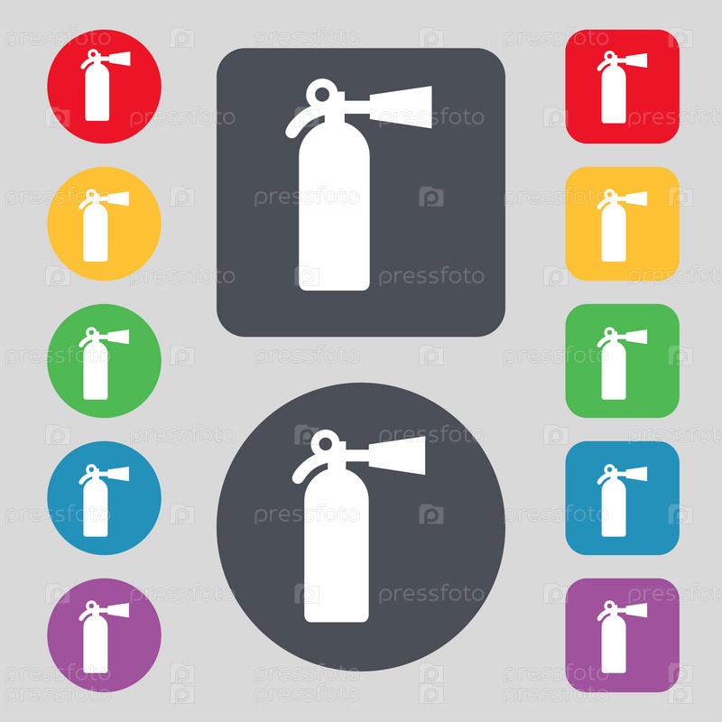 Огнетушитель значок знак. Набор из 12 цветных кнопок. Плоский дизайн. Вектор