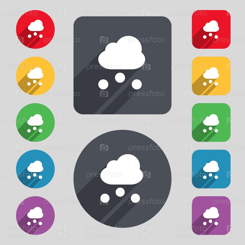 Снег значок знак. Набор 12 цветных кнопок и длинную тень. Плоский дизайн. Вектор