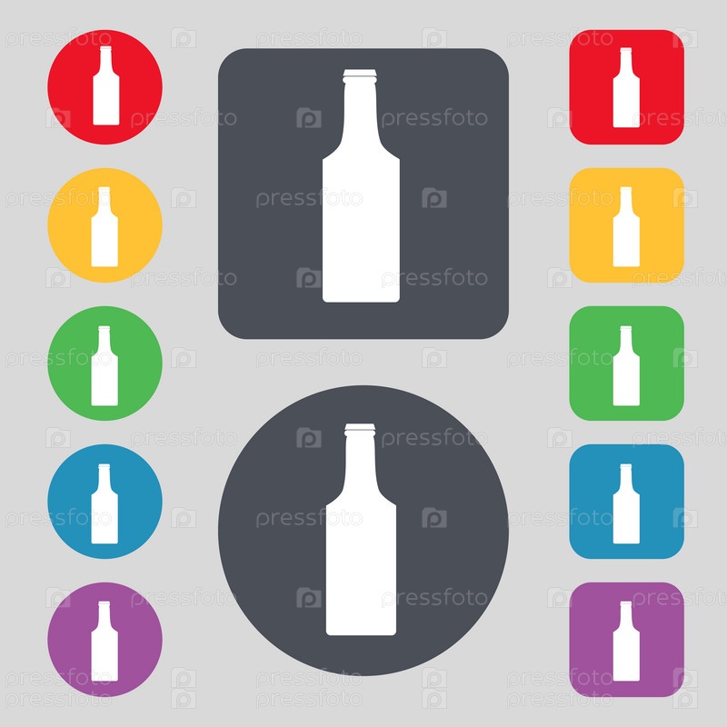 Бутылка значок знак. Набор из 12 цветных кнопок. Плоский дизайн. Вектор
