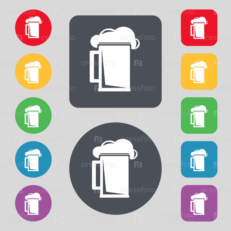 Бокал пива значок знак. Набор из 12 цветных кнопок. Плоский дизайн. Вектор